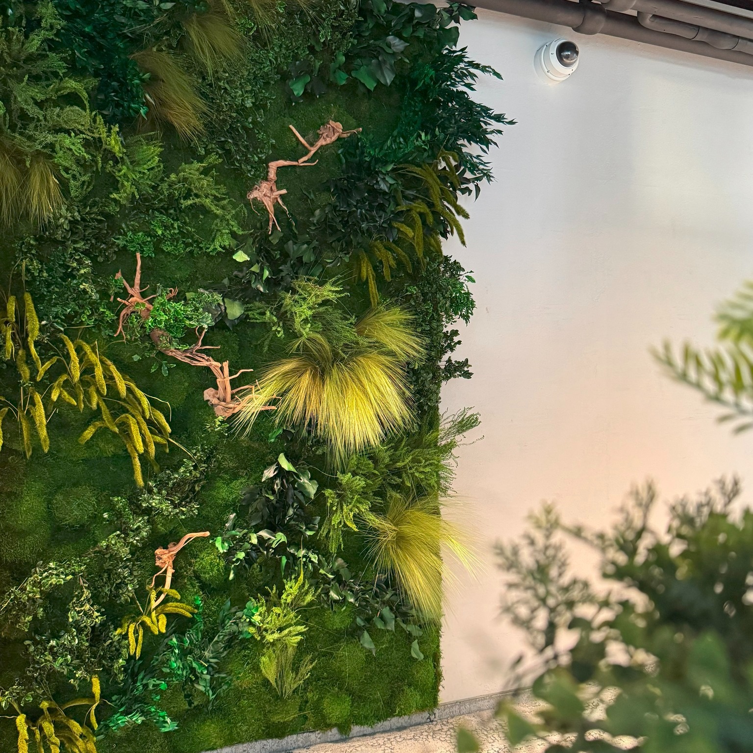 W zielonych ścianach dobrze działają gatunki o niewielkiej bryle korzeniowej. Bluszcz, zielistka, skrzydłokwiat, różne filodendrony i paprocie tworzą podstawę układu. Kwiatowe akcenty zapewnia anturium. Trawy ozdobne wnoszą rytm i lekkość. Kompozycję uatrakcyjniają różnice w fakturze i unerwieniu liścia. Gdy priorytetem jest bezobsługowość, mech stabilizowany daje stabilny kolor i formę, a jednocześnie pozwala tworzyć logo, panele kierunkowe i „obrazy” o powtarzalnym konturze. Dobrze zaplanowany miks osiąga równowagę między masą, kolorem i kierunkiem wzrostu, tak aby ściana nie „rozpadała się” wizualnie po kilku miesiącach.